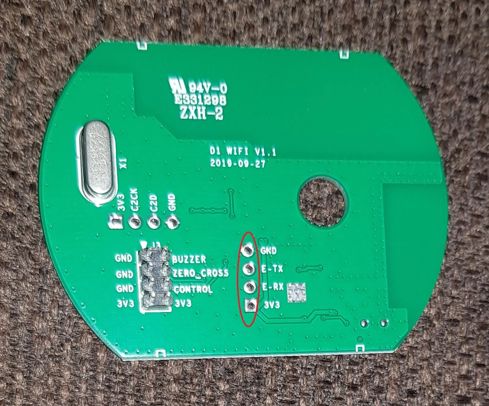 Photo of serial port pins, images by [klotzma](https://github.com/arendst/Tasmota/issues/7598#issuecomment-578433417).