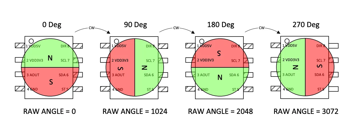 as5600: start_position: 90deg range: 180deg direction: clockwise dir_pin: GPIOXX- If the magnet north was at the right side of the chip (i.e. 1024 / 90deg raw position), the scaled position would report a value of